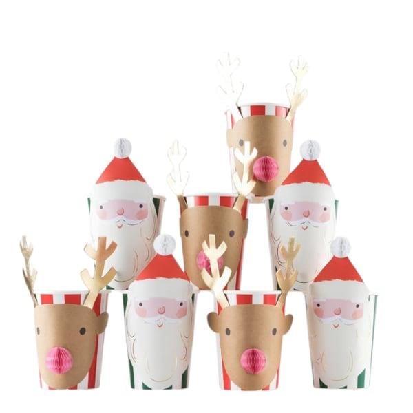 Petek burun ve şapka detayları, basit kurulum için çift taraflı banda sahiptir Ren geyiği kupası üzerinde parlak altın folyo boynuzlar Noel Baba kupası üzerinde parlak altın varak detaylar Sıcak veya soğuk içecekler için uygundur Basit kurulum gereklidir 2 tasarımlı 8'li paket Ürün kapasitesi: 266 ml