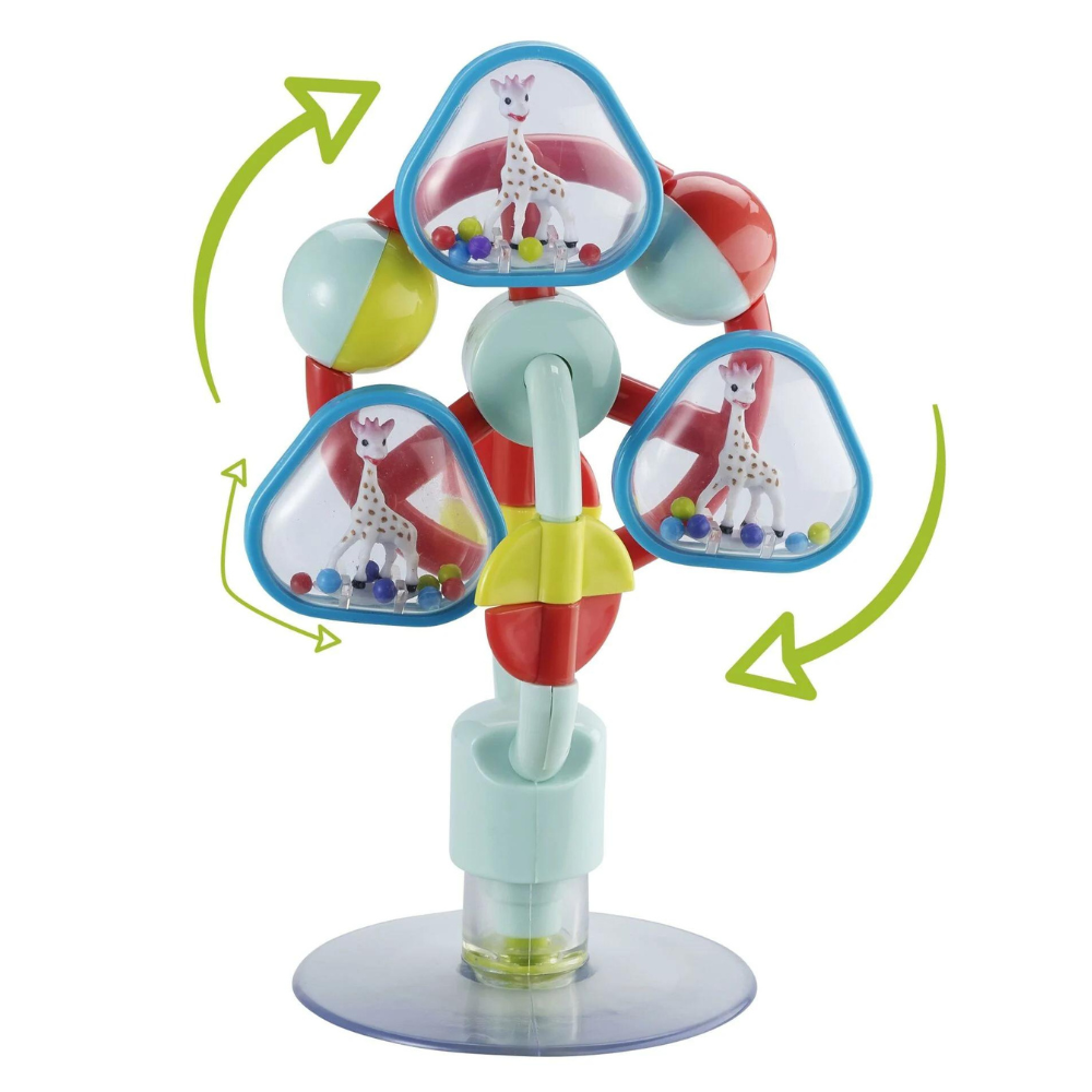 Dönüyor ve çok renkli ama hepsinden güzeli çarkın her bir bölmesinde bulunan bebeğinizin sevimli kahramanı 3 Sophie figürü!